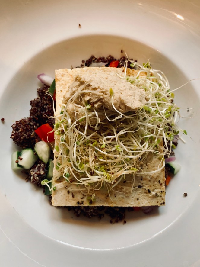 Starving because I hadn’t had much to eat the night before, I was thrilled to see some herbed tofu over quinoa on the menu, so I ordered it. This was easily the best meal I had the whole trip–guys, it was a whole block of tofu. It kept me full for most of the day where pickings were pretty slim.