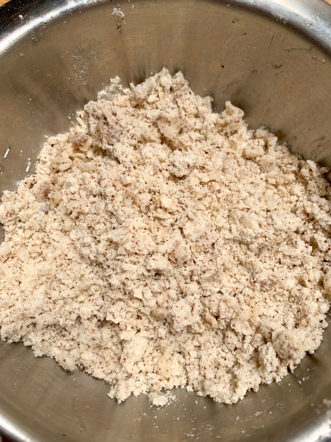 Add in your flax egg and the coconut oil. Using your hands, mix the oil and flax egg into the dry ingredients until the mixture resembles wet sand. When you press it together, it should form into a ball without a ton of effort. If you find it’s a little dry, add a Tbsp of water and mix again.